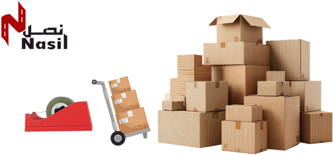 عربات النقل - صناديق بأحجام مختلفة - شريط لاصق - أدوات التفكيك والتركيب - أحزمة وأدوات تثبيت